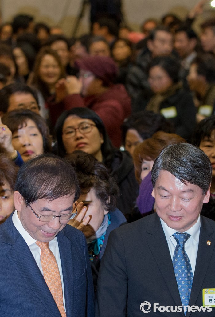 (서울=포커스뉴스) 15일 오후 서울 노원구청 대강당에서 열린 2016 노원구 신년인사회에 참석한 박원순(왼쪽) 서울시장과 안철수(맨 오른쪽) 국민의당 인재영입위원장이 대화하고 있다.
