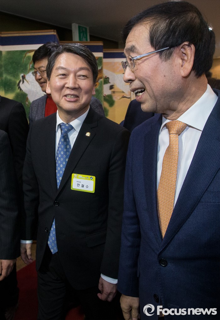 (서울=포커스뉴스) 15일 오후 서울 노원구청 대강당에서 열린 2016 노원구 신년인사회에 참석한 안철수(왼쪽) 국민의당 인재영입위원장과박원순 서울시장이 대화하고 있다.