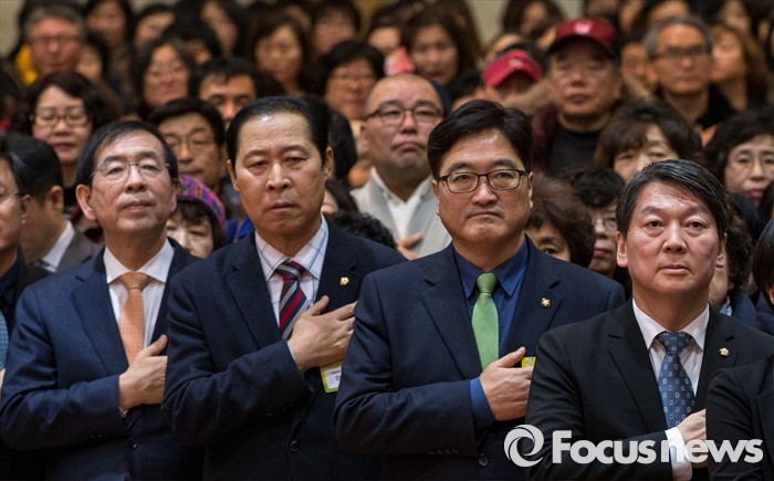 (서울=포커스뉴스) 15일 오후 서울 노원구청 대강당에서 열린 2016 노원구 신년인사회에 참석한 박원순(앞줄 맨 왼쪽부터) 서울시장, 이노근 새누리당 의원, 우원식 더불어민주당 의원, 안철수 국민의당 인재영입위원장이 묵념하고 있다.