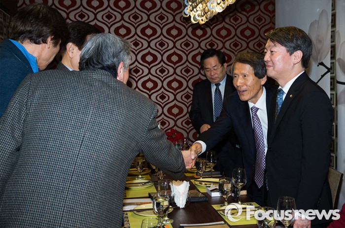(서울=포커스뉴스) 한상진(오른쪽 두번째) 국민의당 창당준비위원장과 안철수(오른쪽) 인재영입위원장이 15일 오후 서울 관악구 한 태국 식당에서 진행된 故 김대중 전 대통령 재임 당시 자문정책기획위원회 모임에 참석해 위원들과 인사하고 있다.