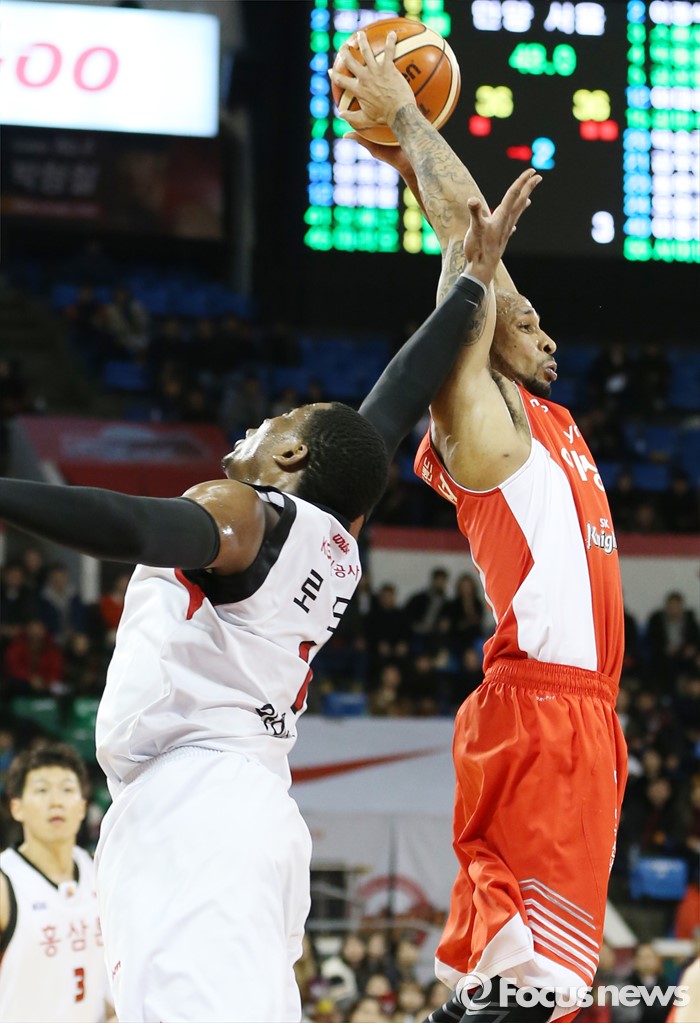 (서울=포커스뉴스) 15일 서울 잠실학생체육관에서 열린 2015-2016 프로농구 SK-KGC 경기에서 SK 스펜서가 KGC 찰스 로드에 앞서 리바운드볼을 잡고 있다.
