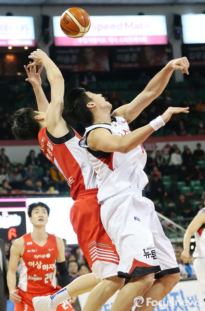 (서울=포커스뉴스) 15일 서울 잠실학생체육관에서 열린 2015-2016 프로농구 SK-KGC 경기에서 KGC 양희종(오른쪽)과 SK 박형철이 리바운드볼을 다투고 있다.