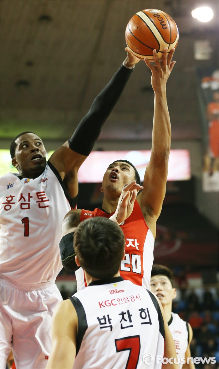(서울=포커스뉴스) 15일 서울 잠실학생체육관에서 열린 2015-2016 프로농구 SK-KGC 경기에서 SK 박승리의 레이업슛을 KGC 찰스 로드가 뒤에서 블록을 시도하고 있다.