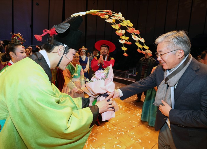(서울=포커스뉴스) 김종덕 문화체육관광부 장관이 안호상 국립극장장 등 관계자들과16일 서울 국립극장에서 선보인 극장형 마당놀이 ‘춘향이 온다’를 관람하고 배우들을 격려하고 있다. <사진제공=문화체육관광부>