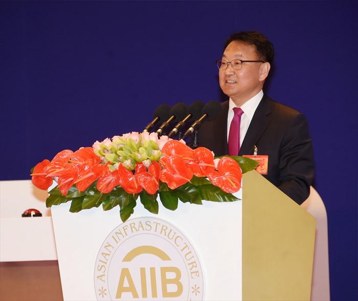 (북경=포커스뉴스) 아시아 인프라 투자은행(AIIB) 창립총회 참석차 중국 북경을 방문중인 유일호 부총리 겸 기획재정부이 16일(현지시간) 조어대에서 열린 개소식에서 축사를 하고 있다. <사진제공=기획재정부>