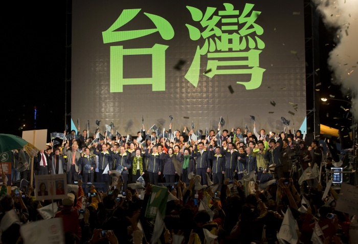 민진당 관계자들이 16일 밤 타이베이에서 선거 승리를 자축하고 있다.(Photo by Ashley Pon/Getty Images)