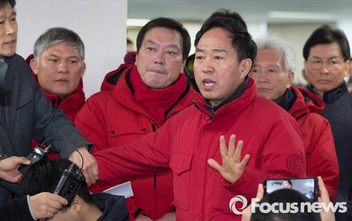 (서울=포커스뉴스) 안대희 전 대법관이 17일 서울 여의도 새누리당사에서 열린 기자회견에서 제 20대 총선 마포갑 출마를 공식 선언을 하자 강승규 마포갑 당협위원장이 항의하고 있다.