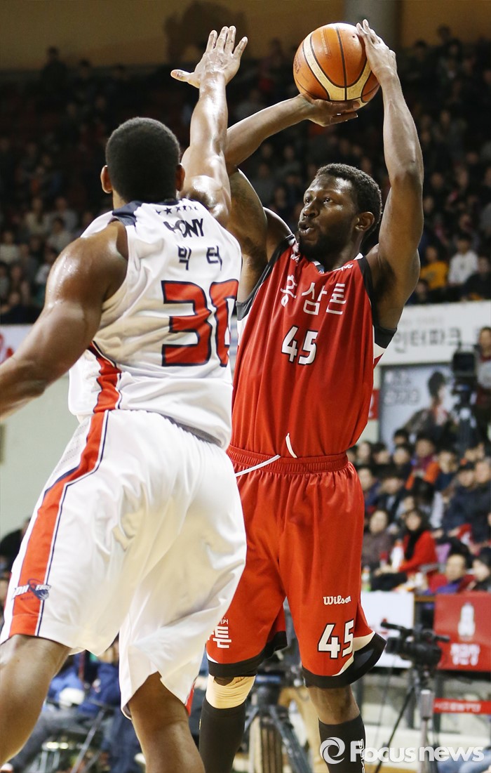 (안양=포커스뉴스) 17일 안양실내체육관에서 열린 2015-2016 프로농구 KGC-모비스 경기에서 KGC 마리오 리틀의 외곽슛을 모비스 빅터가점프하며 막고 있다.