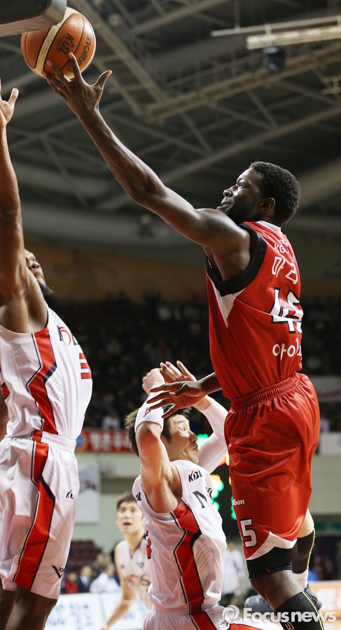 (안양=포커스뉴스) 17일 안양실내체육관에서 열린 2015-2016 프로농구 KGC-모비스 경기에서 KGC 마리오 리틀이 모비스 양동근, 빅터의 마크를 피하며 레이업슛을 시도하고 있다.