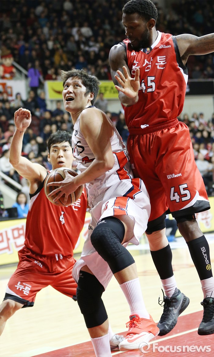 (안양=포커스뉴스) 17일 안양실내체육관에서 열린 2015-2016 프로농구 KGC-모비스 경기에서 모비스 함지훈이 KGC 김윤태와 마리오 리틀의 밀착수비를 따돌리며 슈팅을 노리고 있다.