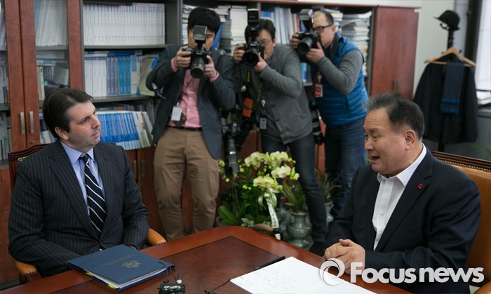(서울=포커스뉴스) 이상민(오른쪽) 법제사법위원장이 18일 오전 서울 여의도 국회 위원장실에서 4개국 외교사절(미국, 영국, 호주, EU)을 대표해 방문한 마크 리퍼트 주한미국대사와 외국법자문사법 개정안과 관련 논의를 하고 있다.