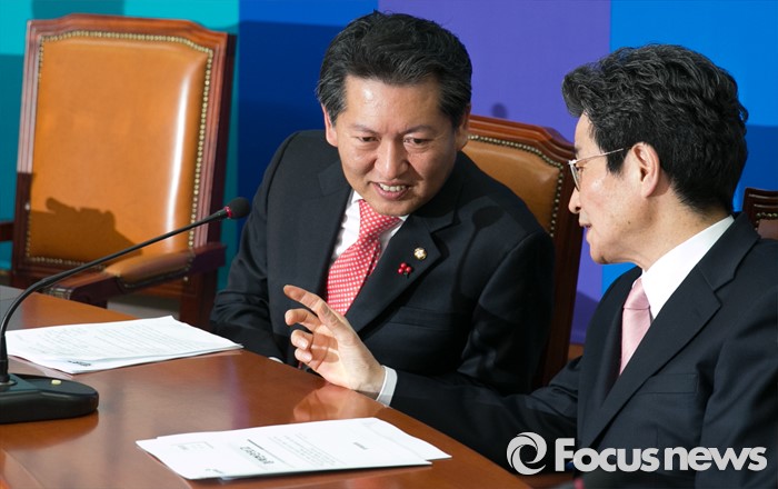 (서울=포커스뉴스) 정청래(왼쪽) 더불어민주당 최고위원이 18일 오전 서울 여의도 국회에서 열린 최고위원회의에 참석해 이목희 정책위의장과 대화하고 있다.