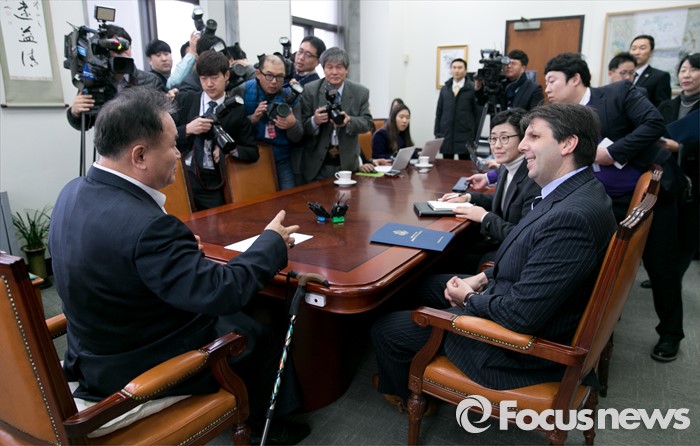 (서울=포커스뉴스) 이상민(왼쪽) 법제사법위원장이 18일 오전 서울 여의도 국회 위원장실에서 4개국 외교사절(미국, 영국, 호주, EU)을 대표해 방문한 마크 리퍼트 주한미국대사와 외국법자문사법 개정안과 관련 논의를 하고 있다.