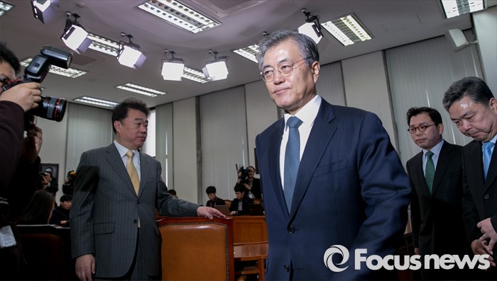 (서울=포커스뉴스) 문재인(왼쪽 두번째) 더불어민주당 대표가 18일 오전 서울 여의도 국회에서 오성규(오른쪽 두번째) 전 서울시설관리공단 이사장과 김민영(오른쪽 첫번째) 전 참여연대 사무처장 인재영입 기자회견을 마친 뒤 퇴장하고 있다.