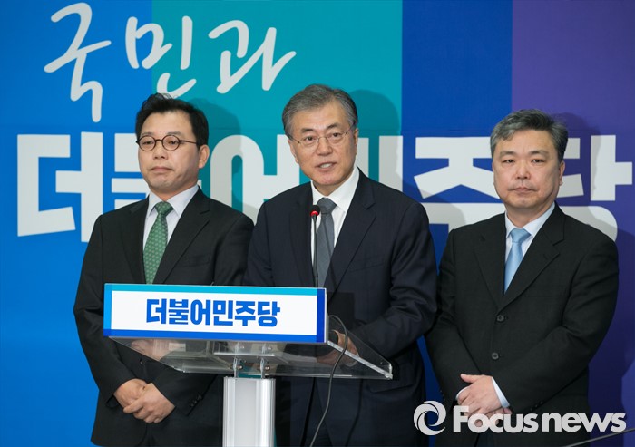 (서울=포커스뉴스) 문재인(가운데) 더불어민주당 대표가 18일 오전 서울 여의도 국회에서 오성규(왼쪽) 전 서울시설관리공단 이사장과 김민영 전 참여연대 사무처장 인재영입 기자회견에 참석해 발언하고 있다.