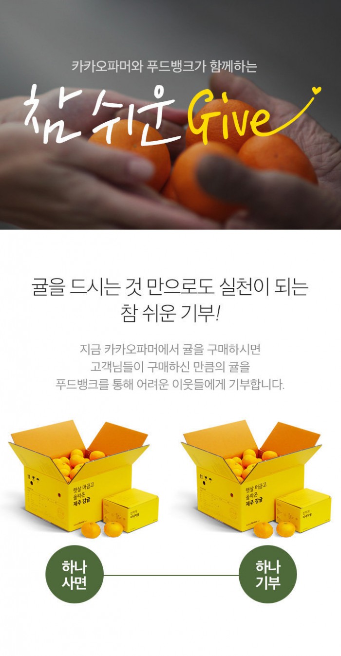 한편, 카카오파머 제주는 가장 맛있는 농산물을 선별해 가장 맛있을 때 고객에게 전달하자는 취지로 기획된농산물 온오프라인연계(O2O·Online to Offline) 비즈니스로 오는 1월말까지 운영되는 파일럿 프로그램이다. 제주감귤 5㎏ 1박스가 1만5000원(배송비 포함)에 판매된다.카카오파머 기부 캠페인 <사진제공=카카오>