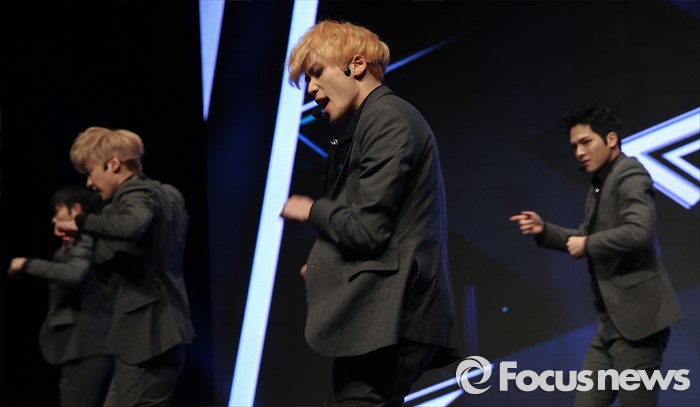 (서울=포커스뉴스) 18일 오전 서울 강남구 일지아트홀에서 열린 아이돌 그룹 틴탑의 미니앨범 'RED POINT' 쇼케이스에 참석한 멤버 니엘(가운데)가 신곡 '사각지대'의 무대를 선보이고 있다.