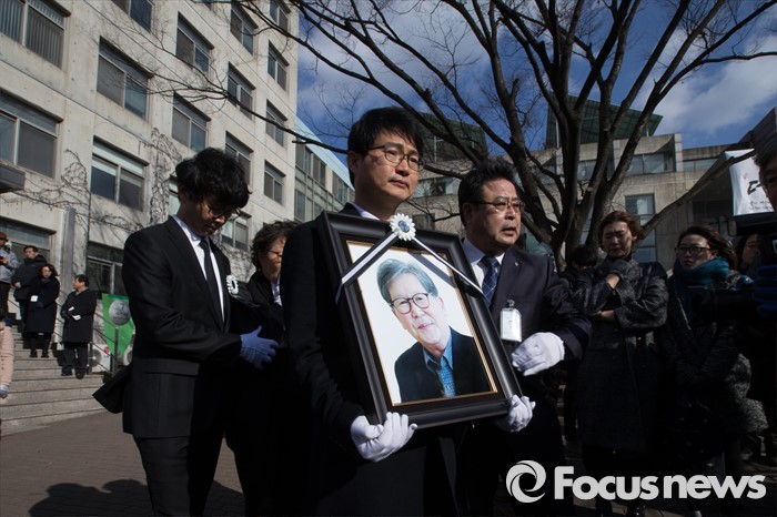 (서울=포커스뉴스) 18일 오후 서울 구로구 성공회대학교 대학성당에서 故 신영복 석좌교수 영결식이 끝나고 고인의 영정과 유해가 운구되고, 영정은 교수실을 들려 차량으로 향하고 있다.