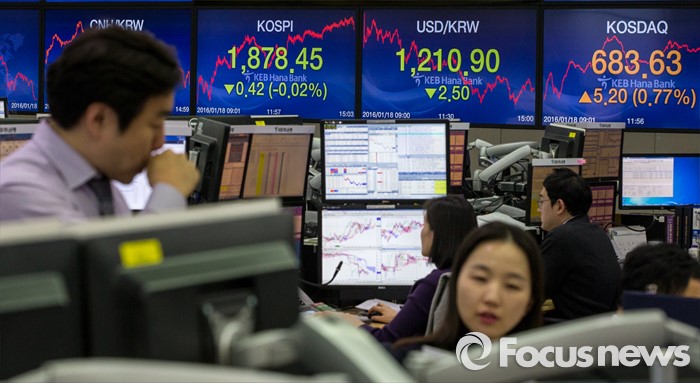 (서울=포커스뉴스) 코스피 지수가 중국 경제에 대한 불안감과 국제유가 하락 등의 여파로 전 거래일 대비 0.42포인트(0.02%) 하락한 1878.45로 마감한 18일 오후 서울 중구 KEB하나은행 딜링룸에서 딜러들이 업무를 보고 있다. 이날 원달러 환율은 전 거래일보다 1.5원 하락한 1,210.9원, 원위안 환율은 전거래일보다 0.63원 오른 183.93원에 장을 마쳤다.