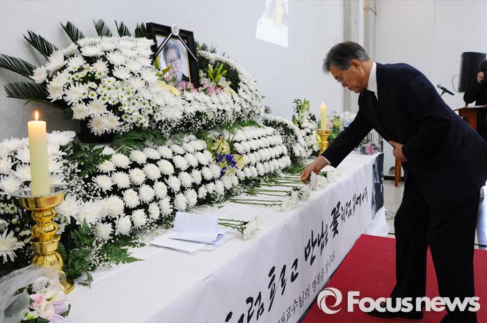 (서울=포커스뉴스) 18일 오후 서울 구로구 성공회대학교 대학성당에서 열린 故 신영복 석좌교수 영결식에서 문재인 더불어민주당 대표가 헌화를 하고 있다. <사진제공=성공회대>