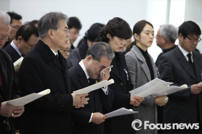 (서울=포커스뉴스) 18일 오후 서울 구로구 성공회대학교 대학성당에서 열린 故 신영복 석좌교수 영결식에서 문재인(왼쪽 두번째) 더불어민두장 대표와 이재정 경기도교육감 등 참석자들이 고별 예식을 하고 있다. <사진제공=성공회대>