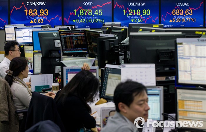 (서울=포커스뉴스) 코스피 지수가 중국 경제에 대한 불안감과 국제유가 하락 등의 여파로 전 거래일 대비 0.42포인트(0.02%) 하락한 1878.45로 마감한 18일 오후 서울 중구 KEB하나은행 딜링룸에서 딜러들이 업무를 보고 있다. 이날 원달러 환율은 전 거래일보다 1.5원 하락한 1,210.9원, 원위안 환율은 전거래일보다 0.63원 오른 183.93원에 장을 마쳤다.