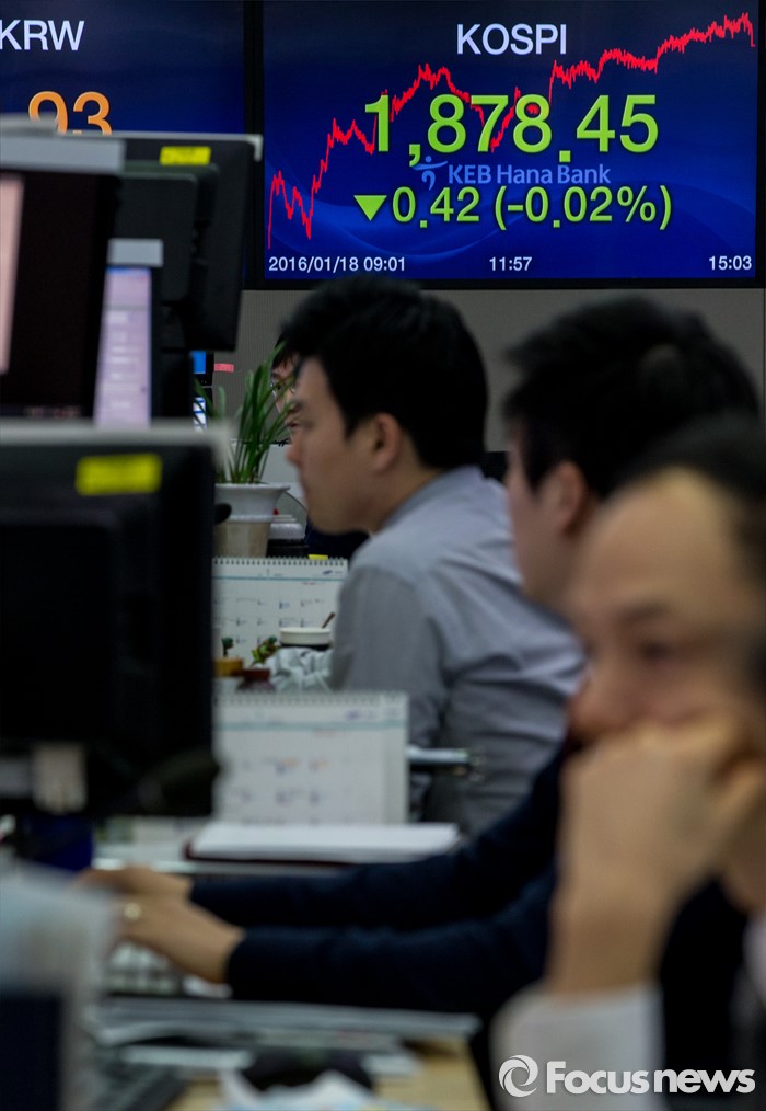 (서울=포커스뉴스) 코스피 지수가 중국 경제에 대한 불안감과 국제유가 하락 등의 여파로 전 거래일 대비 0.42포인트(0.02%) 하락한 1878.45로 마감한 18일 오후 서울 중구 KEB하나은행 딜링룸에서 딜러들이 업무를 보고 있다. 이날 원달러 환율은 전 거래일보다 1.5원 하락한 1,210.9원, 원위안 환율은 전거래일보다 0.63원 오른 183.93원에 장을 마쳤다.