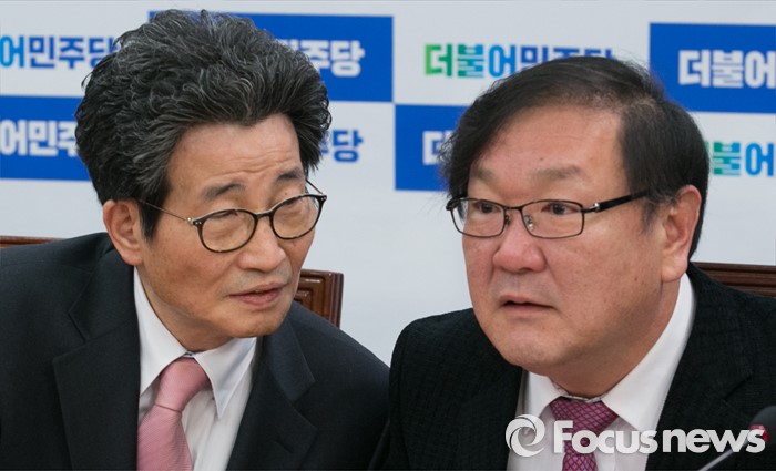 (서울=포커스뉴스) 이목희(왼쪽) 더불어민주당 정책위의장과 김태년 누리과정대책특위원장이 19일 오전 서울 여의도 국회에서 열린 원내대책회의에 참석해 대화하고 있다.