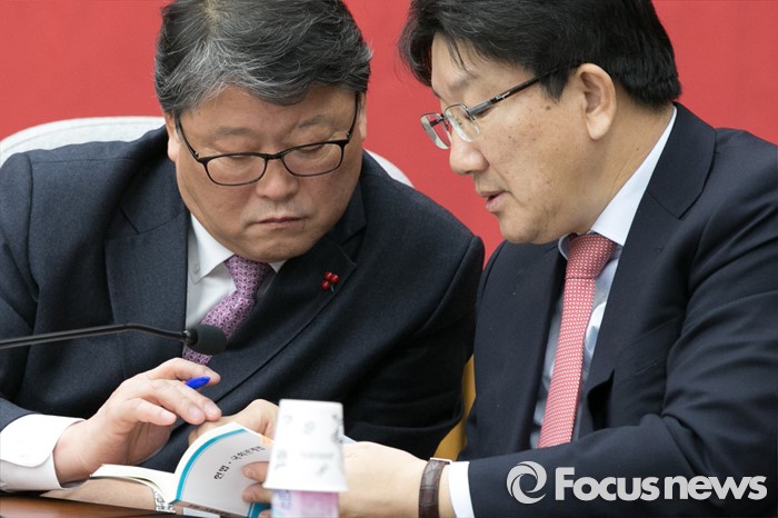 (서울=포커스뉴스) 조원진(왼쪽) 새누리당 원내수석부대표와 권성동 전략기획본부장이 19일 오전 서울 여의도 국회에서 열린 원내대책회의에 참석해 대화하고 있다.