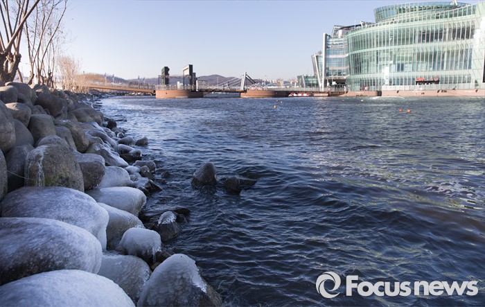 (서울=포커스뉴스) 서울 아침기온이 영하 15도까지 내려간 19일 오전 서울 서초구 반포한강공원 바위에 얼음이 얼어 있다.
