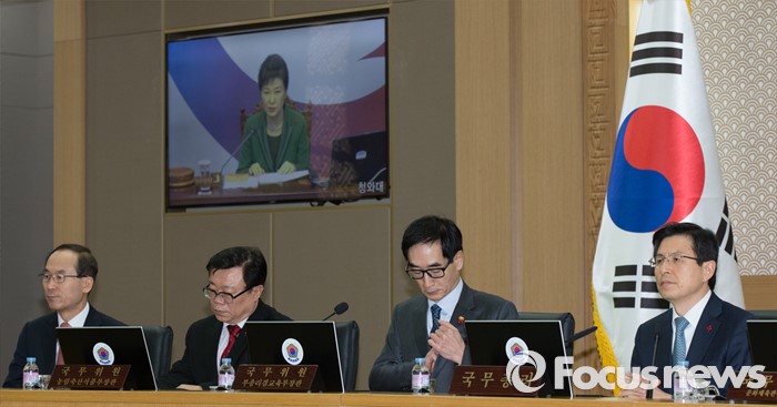 (세종=포커스뉴스) 황교안 국무총리가 19일 오전 세종시 정부세종청사 국무회의장에서 열린 청와대-세종청사 영상 국무회의에 참석해 박근혜 대통령의 모두발언을 경청하고 있다.