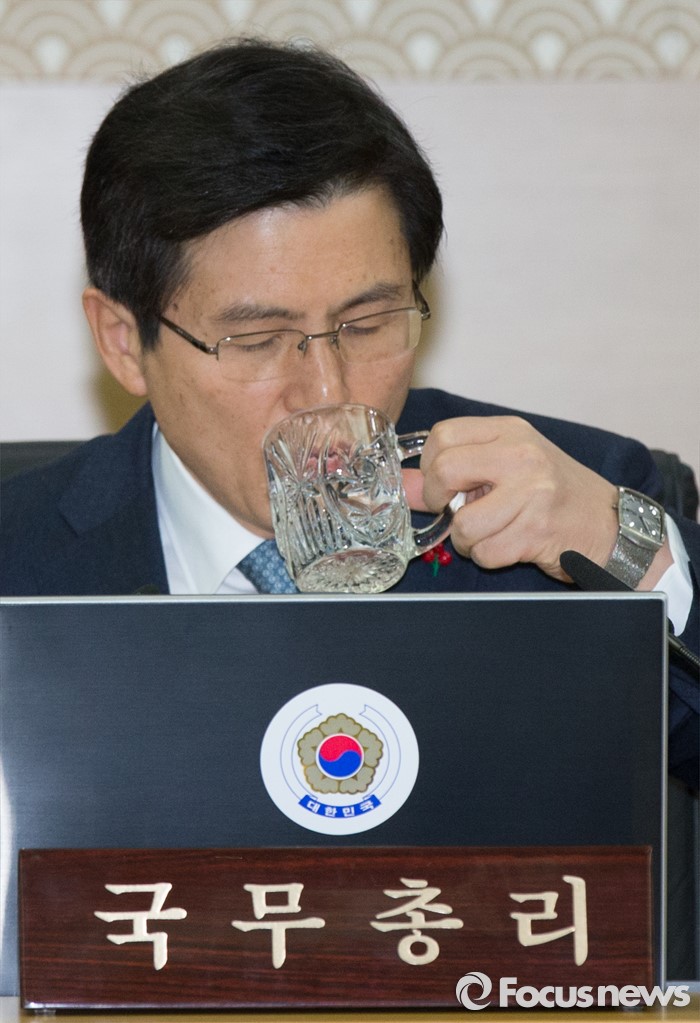 (세종=포커스뉴스) 황교안 국무총리가 19일 오전 세종시 정부세종청사 국무회의장에서 열린 청와대-세종청사 영상 국무회의에 참석해 목을 축이고 있다.