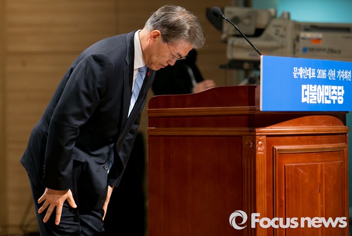 (서울=포커스뉴스) 문재인 더불어민주당 대표가 19일 오전 서울 여의도 국회 의원회관 대회의실에서 신년 기자회견을 마친 뒤 인사하고 있다.