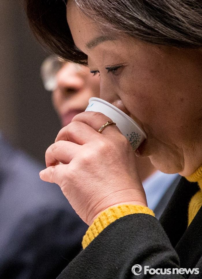 남북관계란 주제로 열린 '2016 신년토론회'에 참석해 물을 마시고 있다.