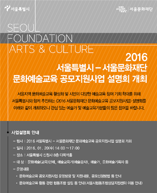 서울문화재단은 이번 지원사업과 관련된 사업설명회를 오는 20일 오후 2시부터 서울시 신청사 8층 다목적홀에서 마련했다. 관심 있는 문화예술단체, 기관, 시민 등은 자유롭게 참석할 수 있다.2016 문화예술교육지원사업 설명회 포스터.<사진제공=서울문화재단>