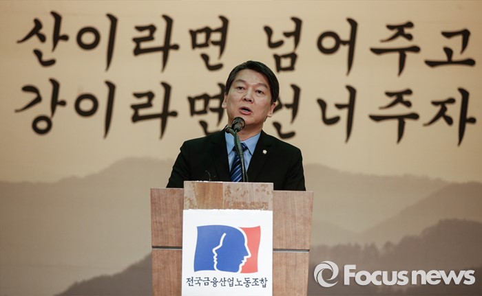 (서울=포커스뉴스) 국민의당 안철수 의원이 19일 오후 서울 중구 은행회관 국제회의실에서 열린 금융노조 제51차 정기전국대의원대회에 참석해 축사를 하고 있다.