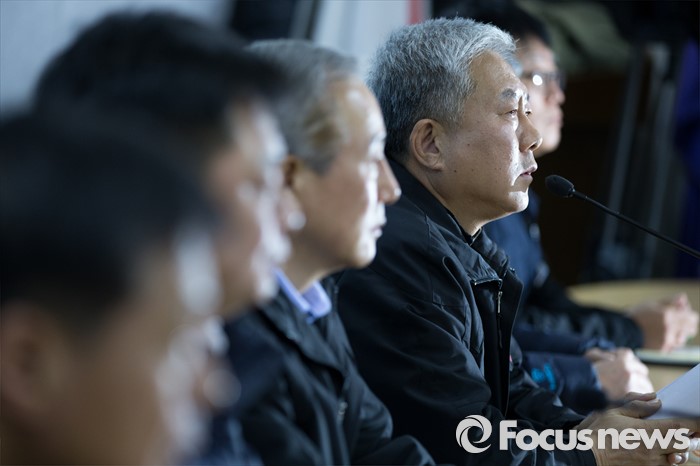 (서울=포커스뉴스) 김동만 한국노총 위원장이 19일 오후 서울 영등포구 한국노동조합총연맹에서 열린 노사정합의 파기 선언 한국노총 기자회견에 선언을 하고 있다.