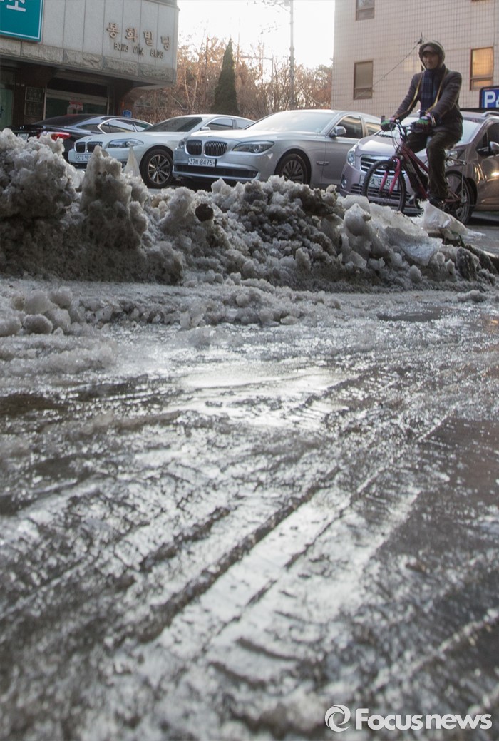 (서울=포커스뉴스) 19일 오후 서울 광진구 동부지방법원 앞 상수관이 노후로 파열돼 인근 도로가 결빙돼 있다.