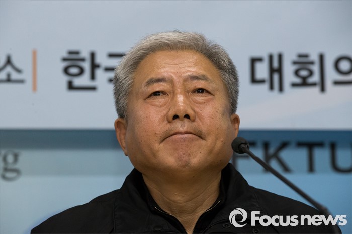 (서울=포커스뉴스) 김동만 한국노총 위원장이 19일 오후 서울 영등포구 한국노동조합총연맹에서 열린 노사정합의 파기 선언 한국노총 기자회견에 선언을 끝낸 뒤 취재진의 질문을 받고 있다.