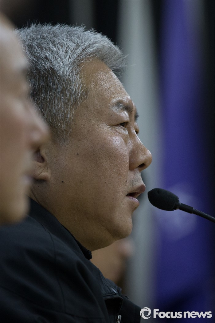 (서울=포커스뉴스) 김동만 한국노총 위원장이 19일 오후 서울 영등포구 한국노동조합총연맹에서 열린 노사정합의 파기 선언 한국노총 기자회견에 선언을 하고 있다.