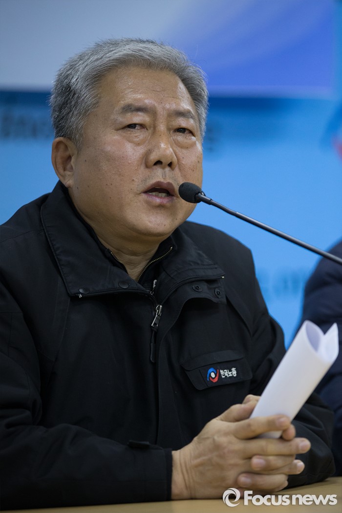 (서울=포커스뉴스) 김동만 한국노총 위원장이 19일 오후 서울 영등포구 한국노동조합총연맹에서 열린 노사정합의 파기 선언 한국노총 기자회견에 선언을 하고 있다.