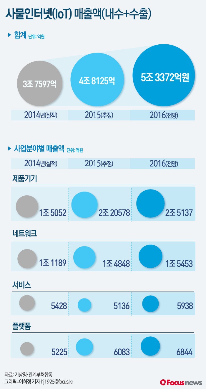 (서울=포커스뉴스) 19일 미래창조과학부가 발표한 '2015년 사물인터넷 산업 실태조사'에 따르면 지난해 사물인터넷 시장 매출액이 4조8125억원으로 전년(3조7597억원)에 비해 28% 증가했다.