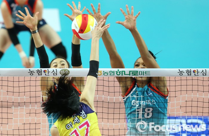 (서울=포커스뉴스) 19일 장충체육관에서 열린 '2015-2016NH농협 V-리그' 여자부 GS칼텍스-흥국생명 경기에서 흥국생명 이재영의 오픈 공격에 GS칼텍스 한송이와 캣벨이 블로킹으로 저지하고 있다.