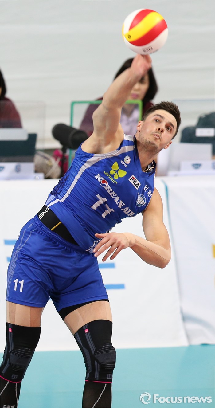 (서울=포커스뉴스) 19일 장충체육관에서 열린 '2015-2016NH농협 V-리그' 남자부 우리카드-대한항공 경기에서 대한항공 모로즈가 스파이크 서브를 넣고 있다.