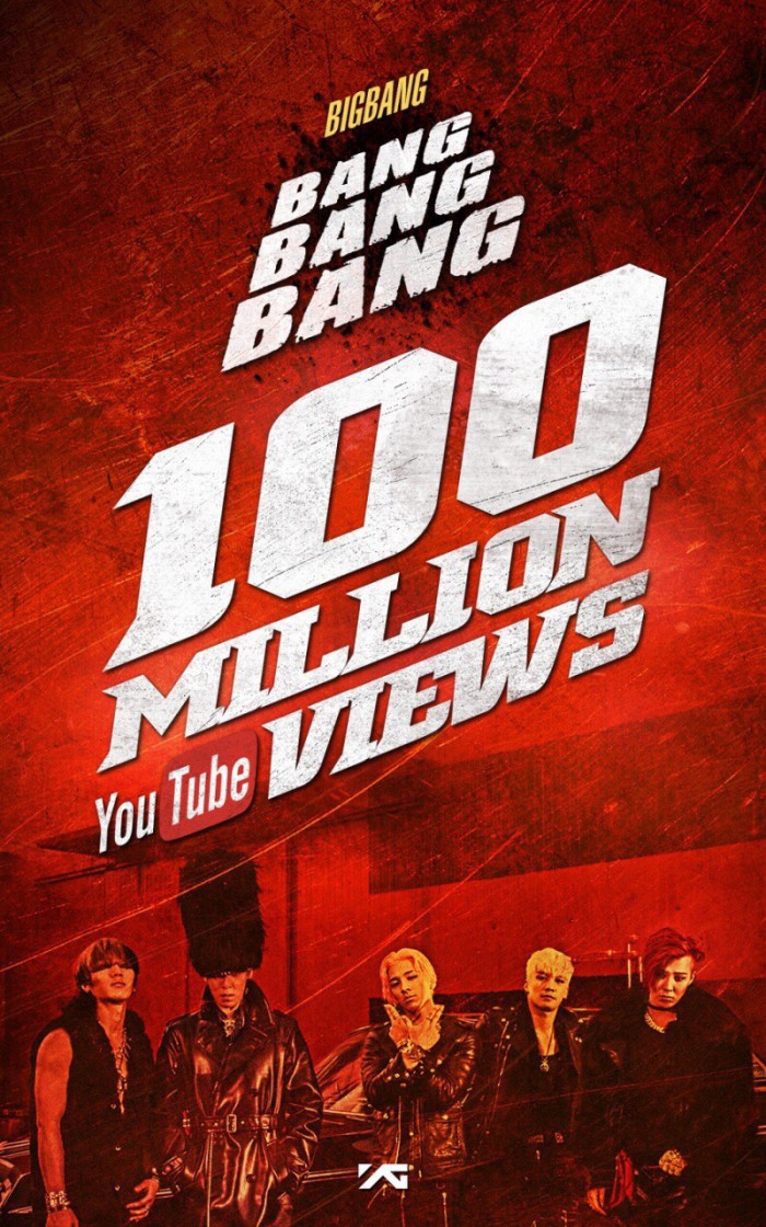 빅뱅의 '뱅뱅뱅' 뮤직비디오는 19일 오후 9시 현재 1억1만3509뷰를 기록하고 있다. 지난해 6월1일 동영상사이트 유튜브에 공개된 지 7개월여 만에 1억뷰 고지를 밟았다. 이로써 빅뱅은 국내 남자그룹 중 최초로 2곡이 1억뷰를 돌파하는 기쁨도 맛봤다. 빅뱅은 지난 2012년 3월 공개한 '판타스틱 베이비'가 1억뷰를 넘어섰다. '판타스틱 베이비'는 2억뷰(현재 1억9842만3887뷰) 돌파도 목전에 두고 있다.