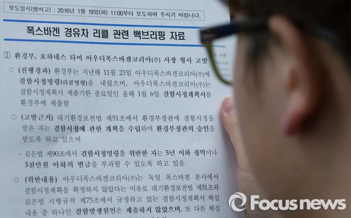 (세종=포커스뉴스) 홍동곤 환경부 교통환경과장이 19일 세종시 정부세종청사 환경부 기자실에서 브리핑을 갖고 아우디폭스바겐코리아 사장 형사고발 관련 입장을 밝혔다. 취재진이 보도자료를 살피고 있다.