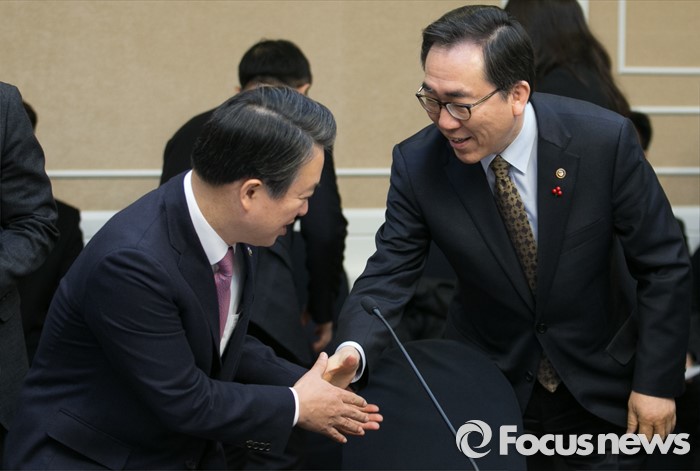 (서울=포커스뉴스) 20일 오전 서울 여의도 국회 귀빈식당에서 열린 테러 위기상황 대처를 위한 합동 당정협의에 참석한 조태열(오른쪽) 외교부 2차관과 강신명 경찰청장이 인사하고 있다.