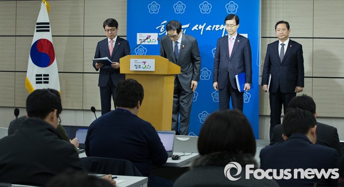 (세종=포커스뉴스) 이준식 사회부총리 겸 교육부장관이 19일 오전 세종시 정부세종청사 교육부 공용브리핑룸에서 국민행복분야 정부합동 업무보고 사전브리핑을 하마치고 인사를 하고 있다. 왼쪽부터 고영선 고용노동부 차관, 이 부총리, 방문규 보건복지부 차관, 권용현 여성가족부 차관.