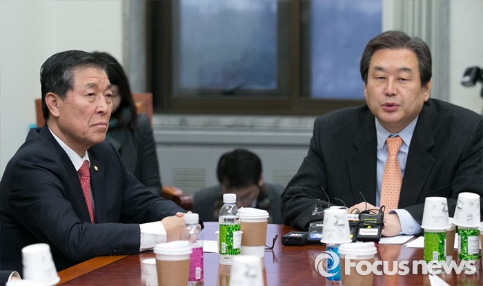 (서울=포커스뉴스) 김무성(오른쪽) 새누리당 대표가 20일 오전 서울 여의도 국회에서 열린 새누리당 제1차 총선기획단 회의에 참석해 모두발언하는 동안 단장인 황진하 사무총장이 경청하고 있다.