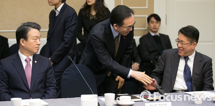 (서울=포커스뉴스) 20일 오전 서울 여의도 국회 귀빈식당에서 열린 테러 위기상황 대처를 위한 합동 당정협의에 참석한 조태열(가운데) 외교부 2차관과 김수민(오른쪽) 국가정보원 2차장이 인사하고 있다. 왼쪽은 강신명 경찰청장.
